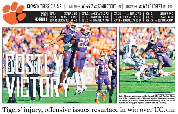 CLEMSON — It wasn’t pretty, and it came at the cost of several more injuries, but the Clemson football team pulled out a 44-7 win over UConn at Memorial Stadium on Saturday.