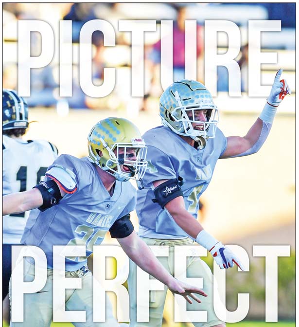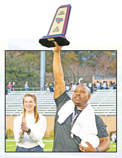 state championship and second perfect season in a row. The victory marked the first time the Lions had taken back-to-back state titles since 1991-92. Above, Daniel defenders Carson Chasteen, left, and Brodey Conn celebrate after a big play against the Bulldogs. At right, Daniel coach Jeff Fruster holds up the championship trophy after the victory. To read more about the game and see more photos scroll down to the Courier’s final Football Frenzy section of the season. Photos by Carl Ackerman/Courtesy The Journal