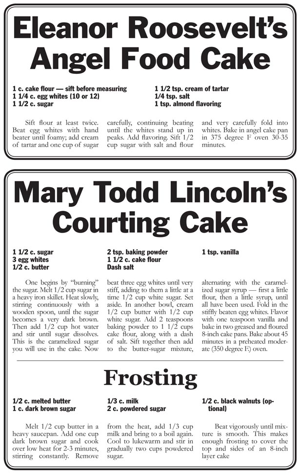 Mary Todd Lincoln is reported to have constantly been trying to get Abraham to eat, as he often was so immersed in work he forgot to eat lunch and frequently settled for an apple or piece of cheese. This Courting Cake is said to have been one of his favorites.