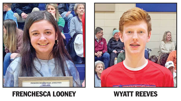 Pickens High School’s Scholar-Athletes of the Week for the week of Jan. 18 were recognized at the Pickens vs. Easley game on Thursday. The female Scholar-Athlete is Frenchesca Looney. She is a sophomore member of the JV cheer team and was nominated by her honors chemistry teacher, Dr. Sarah Miller. Looney is the granddaughter of Lee Grubbs. The male Scholar-Athlete is Wyatt Reeves. Reeves is a junior and member of the varsity basketball team. He is the son of Corey and Brittani Reeves and was also nominated by Dr. Miller. PHS Scholar-Athletes are nominated by their teachers for demonstrating academic excellence, a stellar work ethic and impressive leadership in the classroom.