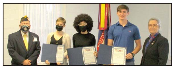 Fleet Reserve Association Branch 15 celebrated the local ninth-12th-grade winners of the 2021-22 National FRA Americanism/Patriotism Essay Contest on Jan. 15. Pictured are branch president Clyde Albertson, 10th-grade winner McKenna Adams, 11th-grade winner Trinity Pryor, 12th-grade winner Clayton Payne and branch essay chairperson Joyce Jones. Not pictured is ninth-grade winner Mary Ruskell. The four local winning essays advance to regionals for judging in February, and potentially to nationals in March.