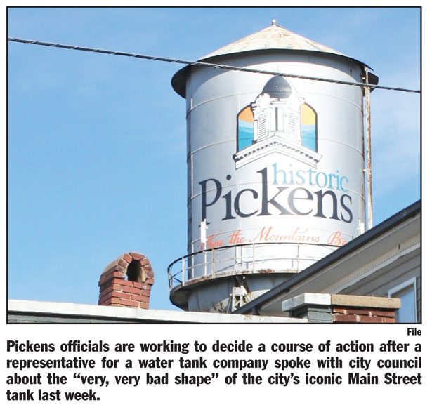 During a special called Pickens City Council meeting March 21, Massie Hughes with American Tank Maintenance presented officials with options concerning the inactive empty water tank that overlooks Main Street.