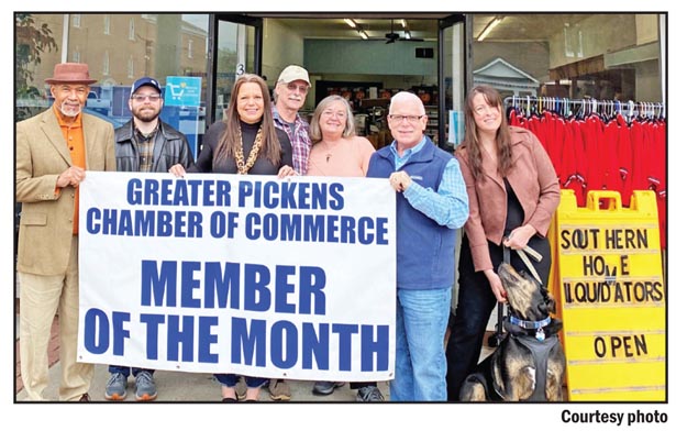 The Greater Pickens Chamber of Commerce March Member of the Month is Southern Home Liquidators, located at 305 E. Main St. in Pickens. Southern Home Liquidators is open Tuesday through Friday from 10 a.m.-7 p.m. and Saturday from 10 a.m.-5 p.m. Southern Home Liquidators provides quality products for customers’ homes at a fraction of the cost. Pictured are Mayor Fletcher Perry, Stephen Bobby, owner Melisa Sedler, Frank and Donna Bobby, chamber president, Bryan Owens, Amber Finley and Moose.