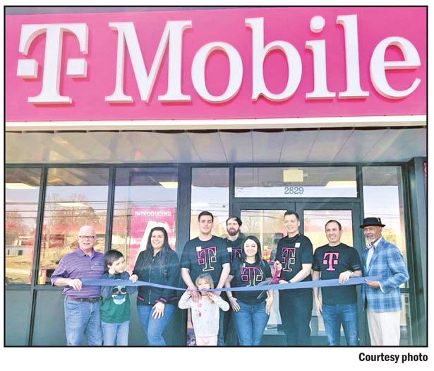 T-Mobile opened its new store at 2829 Gentry Memorial Highway in Pickens on Friday, March 4. Pictured at the ribbon-cutting event are chamber president Bryan Owens and Pickens Mayor Fletcher Perry, who joined store manager Cory Nesbitt and his family and staff during the ceremony.