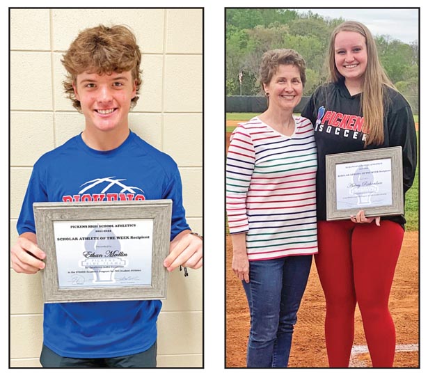 The Pickens High School Scholar Athletes of the Week are Ethan Medlin and Aubrey Richardson. Medlin is a member of the junior varsity baseball team and was nominated by his English teacher, Mike Utley. He is the son of Jonathan Medlin and Tiffany Fernanders. Richardson is a member of the varsity soccer team and was nominated by Lisa Hiott, pictured with her. Richardson is the daughter of Jeff and Anita Richardson.