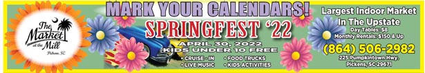 The second annual Springfest is set to kick off at 6 p.m. Saturday at the Market at the Mill, located at 225 Pumpkintown Highway in Pickens.