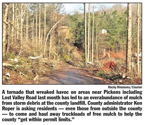 COUNTY — The two tornadoes that hit Pickens County last month left behind a lot of debris, and disposing of that debris has resulted in an opportunity for residents doing yard work.