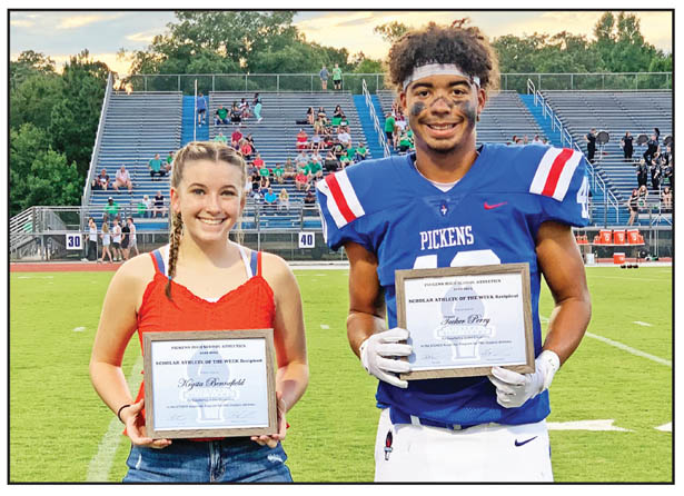 Pickens High School has announced its Scholar-Athletes of the Month for August. Krysta Bennefield is a sophomore member of the PHS JV volleyball team and was nominated by Kimberly Bright for her excellence in the classroom. Bennefield is the daughter of James and Kacie Bennefield. Tucker Perry is a senior member of the varsity football team and was nominated by Tammy Standard for his outstanding leadership both on and off the field. Perry is the son of Lori and David Kocher. PHS Scholar-Athletes are nominated by their teachers for demonstrating academic excellence, a stellar work ethic and impressive leadership in the classroom. This month’s recognition was sponsored by Bee Well Honey Natural Market in Pickens.