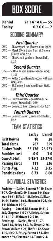 EASLEY — Easley had the tough task of trying to stop two-time defending Class 3A state champion Daniel’s 25- game win streak Friday night in the home opener at Bill Carr Stadium.