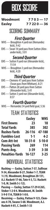 Woodmont followed Easley’s scoring drive with a lengthy 12–play possession, but had to settle for a 34-yard field goal with 5:36 left in the game.