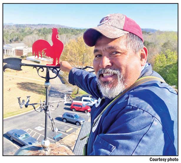 Officials at Dillard Funeral Home and Hillcrest Memorial Park traditionally change the weathervane atop the Dillard building to recognize the winner of the annual Clemson-South Carolina football game. Although the Gamecocks knocked off the Tigers in November to end a rivalry losing streak, the vane was only recently changed with the arrival of spring. Pictured above, Joe Zarate, head of the grounds crew at Hillcrest, wears his South Carolina hat as he replaces the tiger vane with the chicken in honor of the Gamecocks’ 31-30 win.
