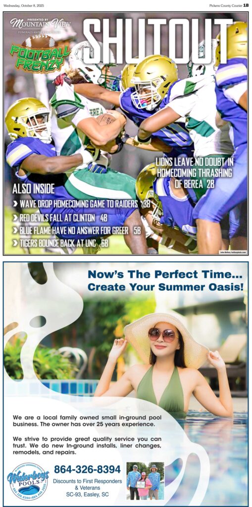 wAVE DROP HOMECOMING TO GREENVILLE; RED DEVILS FALL AT CLINTON; FLAME HAVE NO ANSWER FOR GREER; TIGERS BOUNCE BACK AT UNC all this and more in this week’s FOOTBALL FRENZY, sponsored by Mountain View Funerals and Cremations available only in the Pickens County Courier.