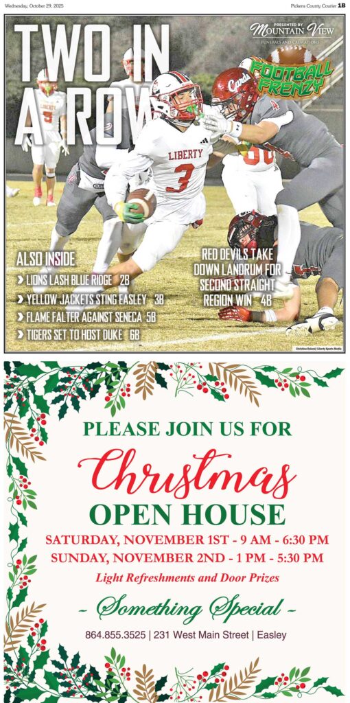 Lions lash Blue Ridge; Yellow Jackets sting Easley; Flame falter against Seneca; Tigers set to host Duke all this and more in this week’s FOOTBALL FRENZY, sponsored by Mountain View Funerals and Cremations available only in the Pickens County Courier.