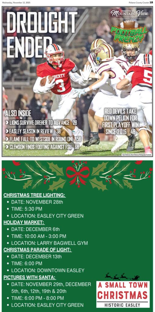 Lions survive Dreher to advance; Easley season in review; Flame fall to westside in round one; Clemson finds footing against FSU all this and more in this week’s FOOTBALL FRENZY, sponsored by Mountain View Funerals and Cremations available only in the Pickens County Courier.