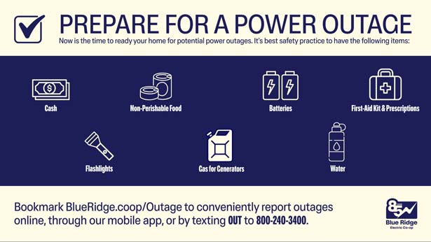 Blue Ridge always maintains a stock of poles, transformers and other equipment to repair damage. Although forecasts continue to change daily, now is the time to prepare for potential power outages, said Blue Ridge CEO/President Jim Lovinggood.