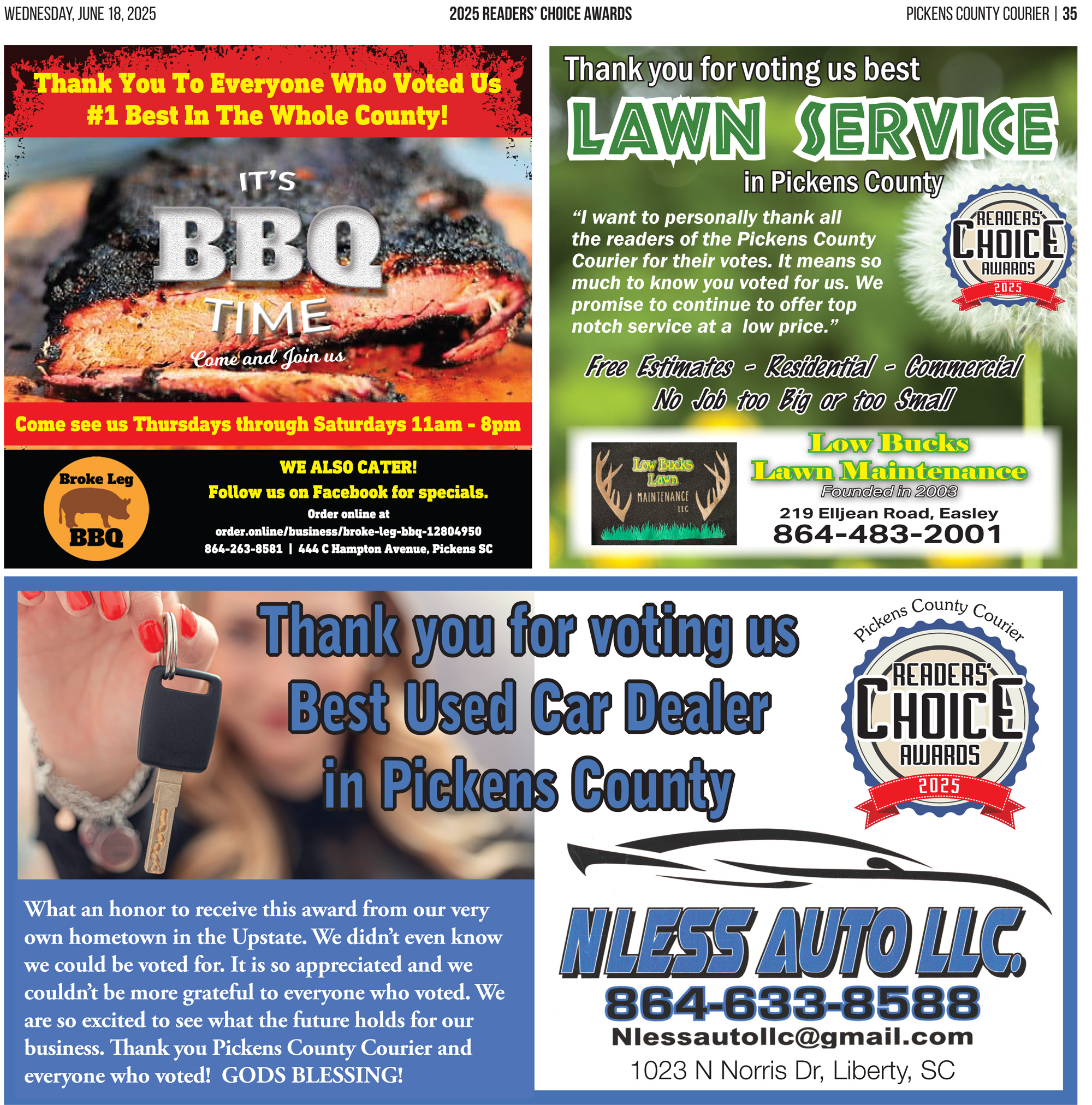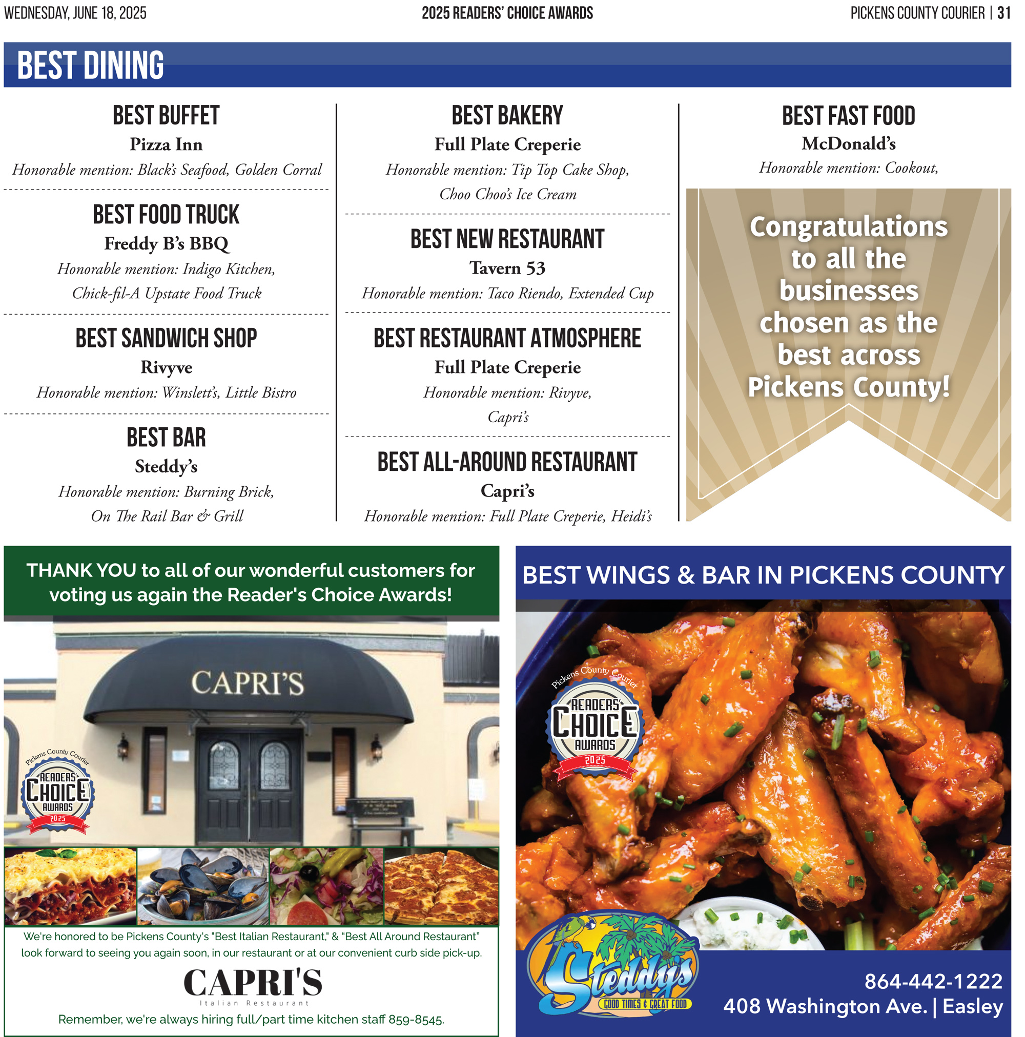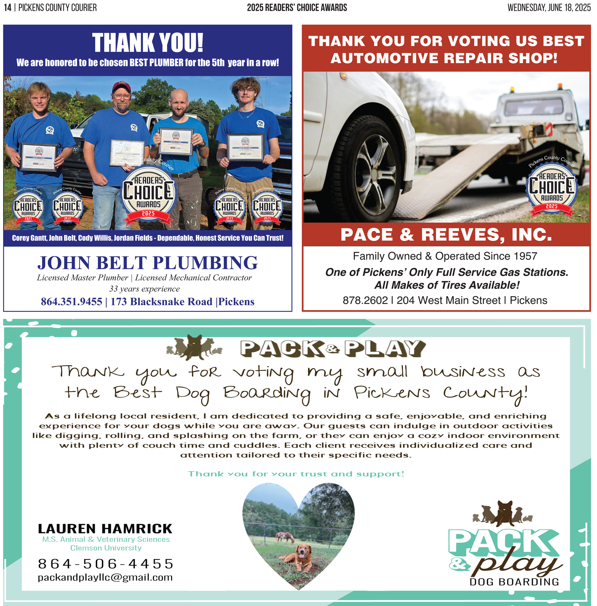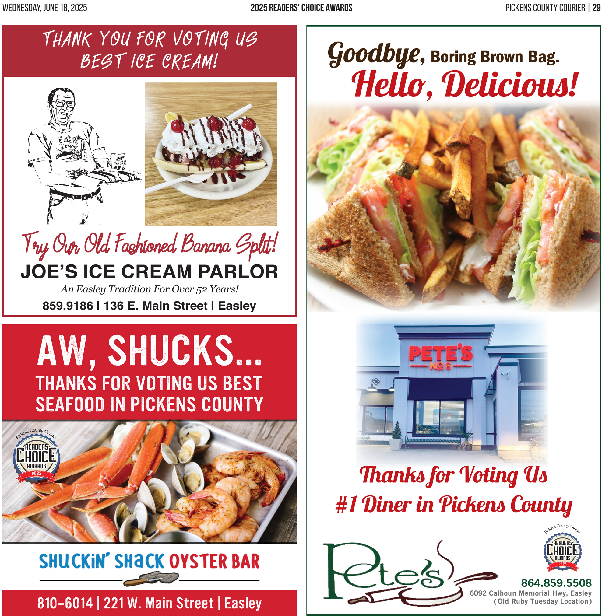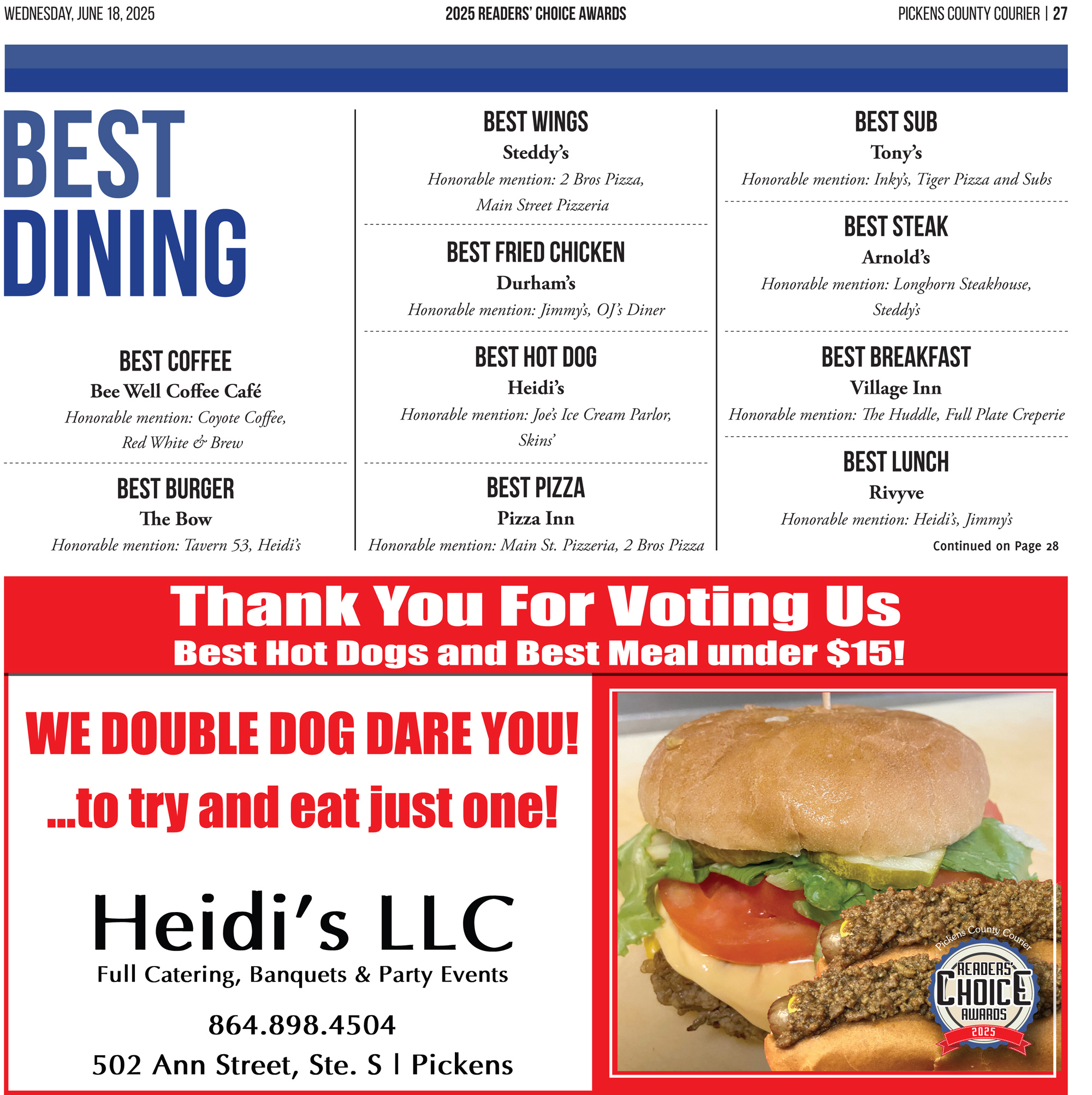 Pickens County Courier readers cast more than 5,000 ballots for their favorite businesses from across the county, and the time has finally come to officially unveil the winners of the seventh-annual Readers’ Choice Awards. Check inside today’s issue for a special keepsake section listing the winners and honorable mentions across more than 100 categories.