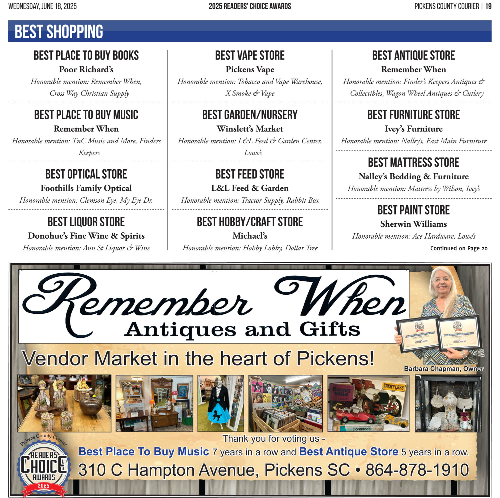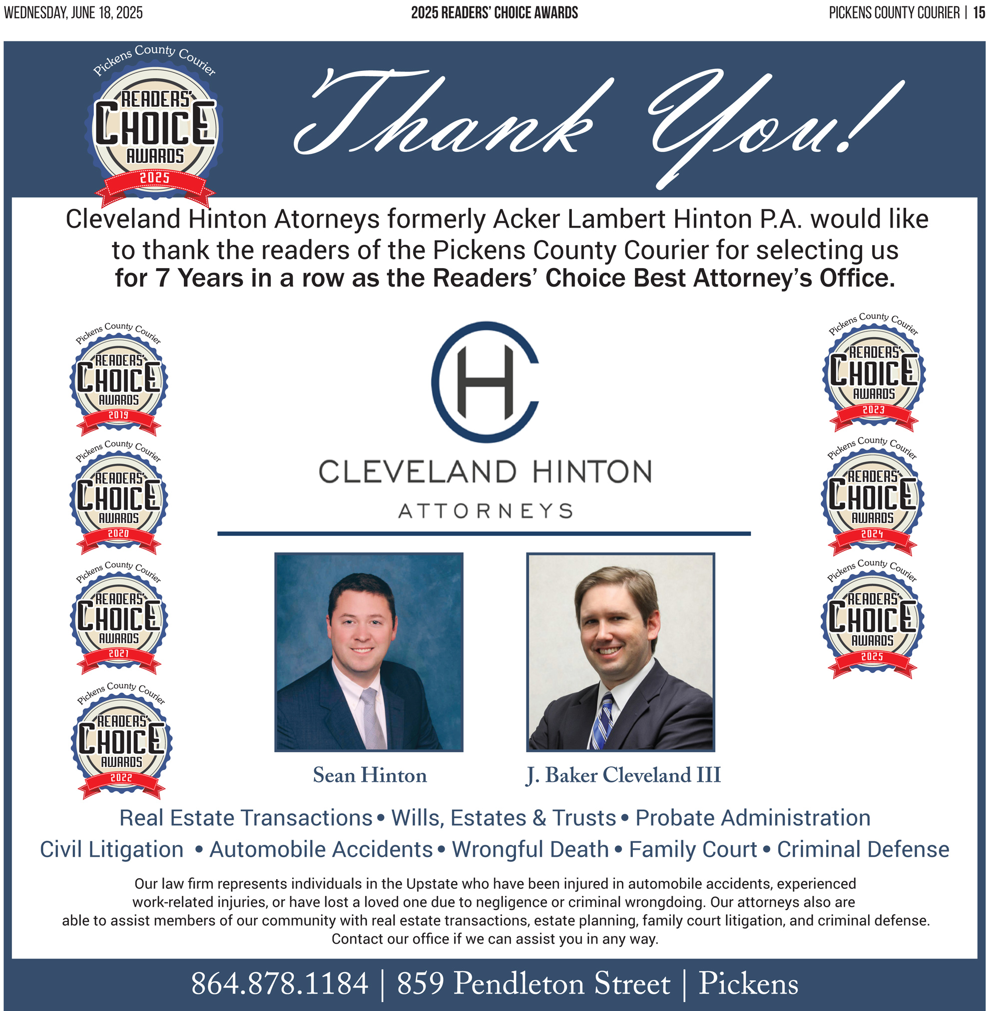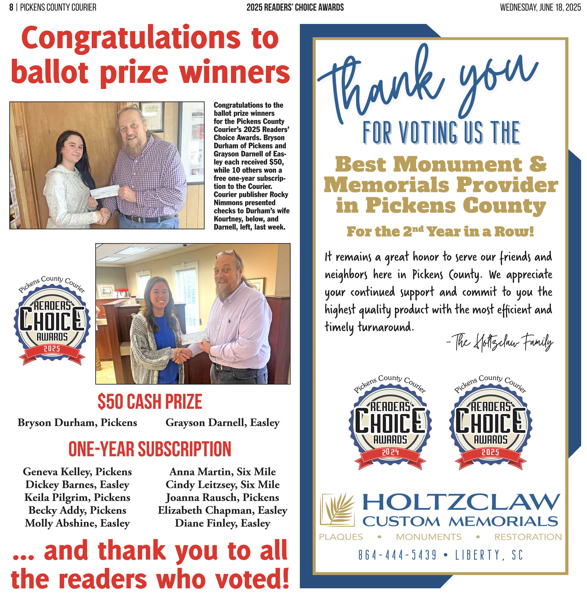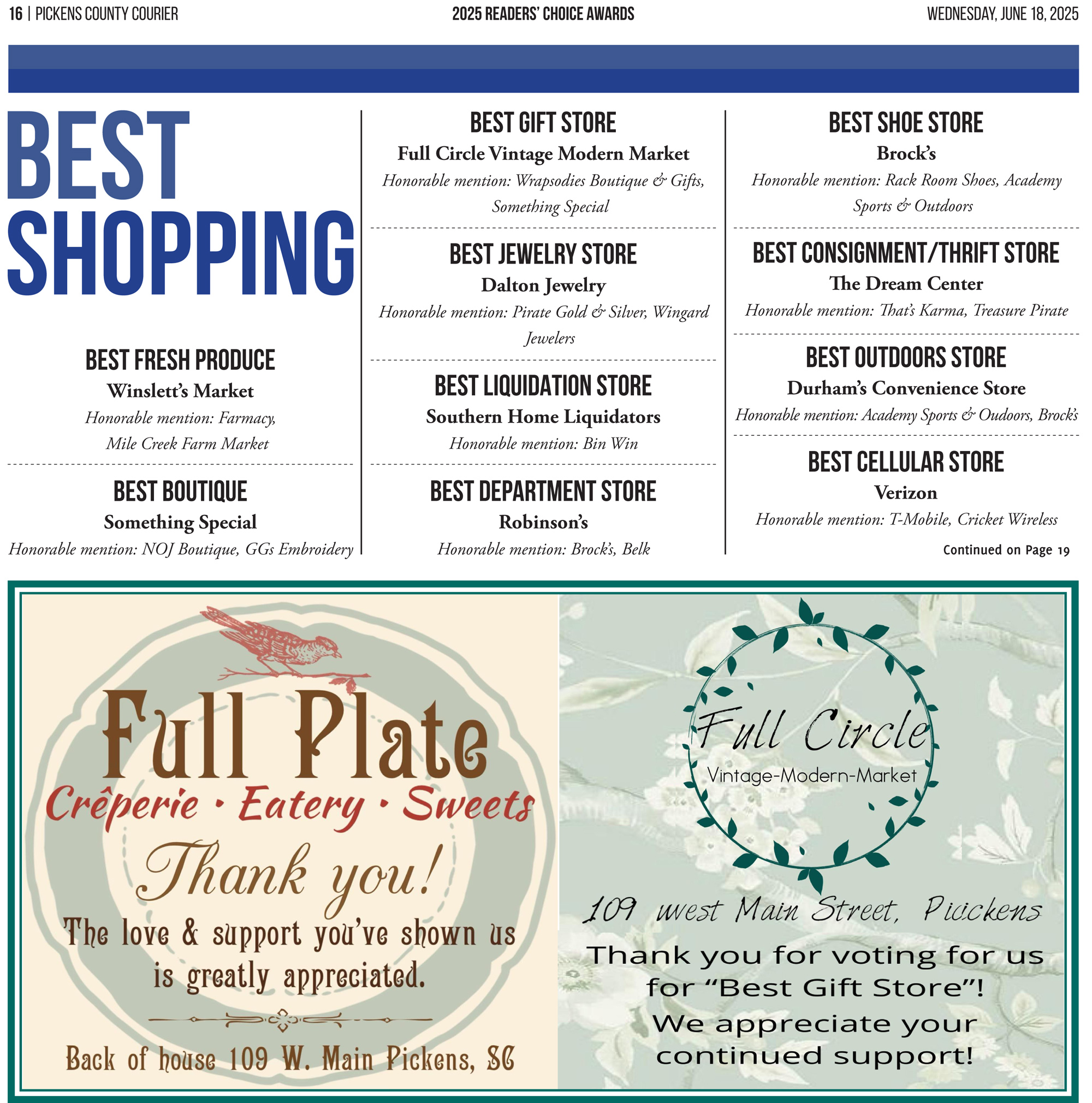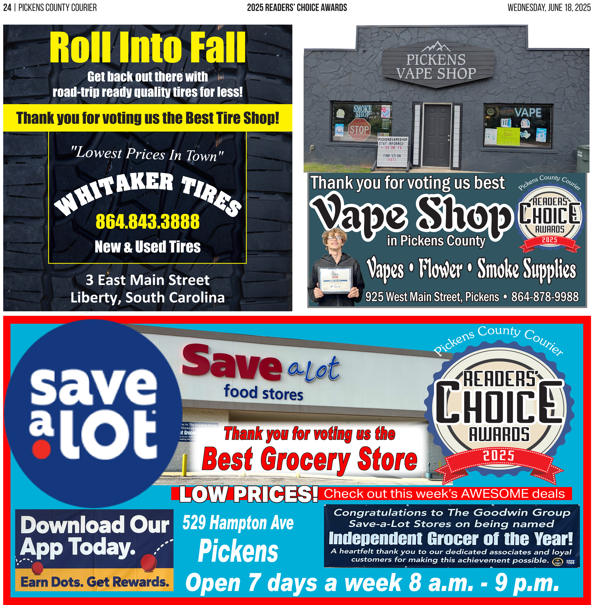 Pickens County Courier readers cast more than 5,000 ballots for their favorite businesses from across the county, and the time has finally come to officially unveil the winners of the seventh-annual Readers’ Choice Awards. Check inside today’s issue for a special keepsake section listing the winners and honorable mentions across more than 100 categories.