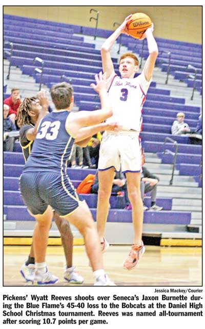 The Blue Flame kicked off the tournament against county rival Daniel and jumped out to a great start behind senior forward Coley Gillian, who scored seven points and blocked two shots as Pickens jumped out to a 13-9 lead over Daniel. Gillian and the Blue Flame kept their strong defensive effort going in the second quarter, as they held the Lions to just four points, with Gillian and Wyatt Reeves adding three blocks apiece in the first half.