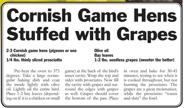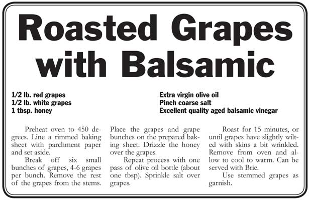 grapes. Then we roasted them in the oven, and when they were ready, removed them from the roasting pan and poured in wine to glaze the pan. After the liquid reduced, it was poured over the duck and they were served. It was a memorable meal.