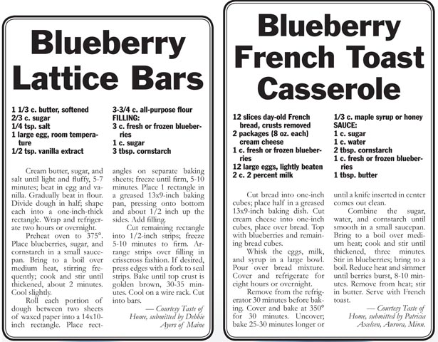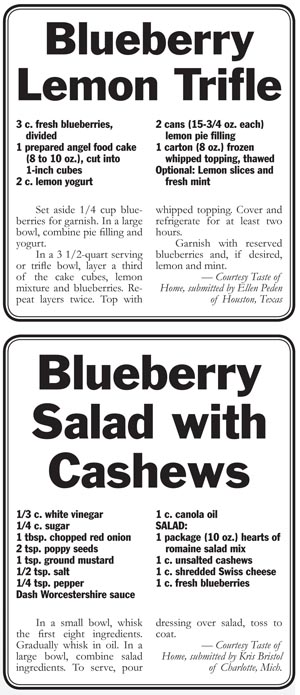 The salad with cashews makes a light side dish, the blueberry lattice bars are a great snack and the blueberry lemon trifle satisfies the most persnickety taste buds.