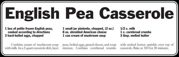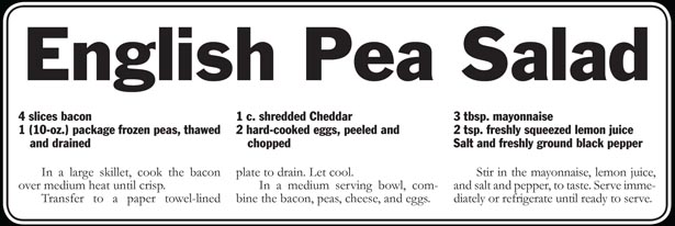 The key to optimum flavor for this week’s featured recipes is to buy baby peas in the freezer section and to be very careful not to overcook them. The cooked peas should be a bright green and should be slightly firm.