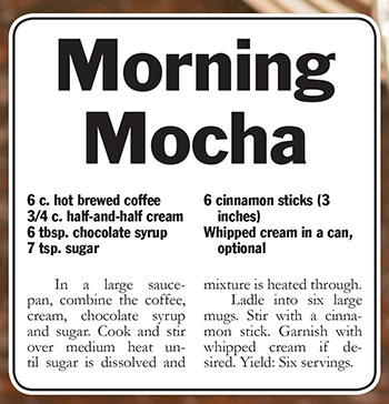 The recipes this week are for a variety of coffee drinks. They’re all different, all good, and all easy. Why spend a fortune buying designer coffee drinks when you can make your own at home, save money and have as many refills as your system can stand?