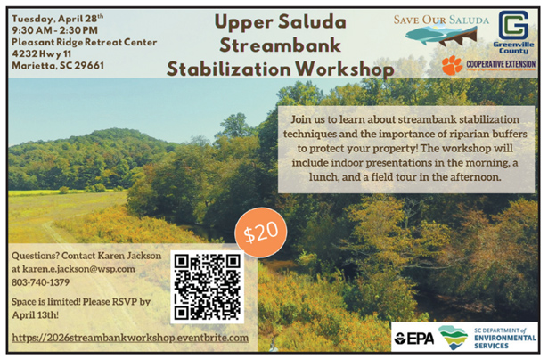 EASLEY — Save Our Saluda and Clemson Extension are excited to announce the 2026 Streambank Stabilization Workshop on Tuesday, April 28 at the Pleasant Ridge Camp and Retreat Center.