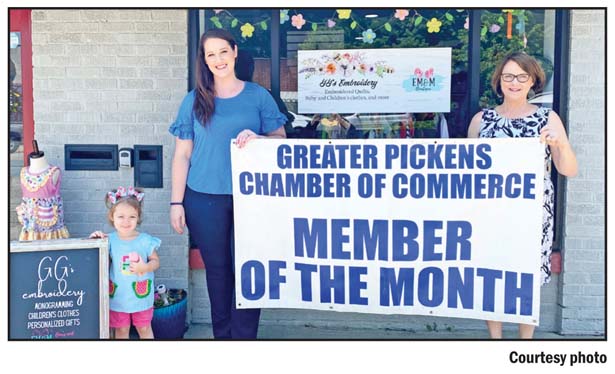 GG’s Embroidery, located at 135 W. Main St. in Pickens, was recently named as the Greater Pickens Chamber of Commerce member of the month. GG’s Embroidery is open Tuesdays 1-6 p.m., Wednesday through Friday 10 a.m.-6 p.m. and Saturday 9 a.m.-2 p.m. GG’s Embroidery is a unique shop filled with home décor, baby and children clothing and more. The store offers special embroidery and monogramming for all sorts of items. Visit ggsembroidery.company.site or Facebook search GGsEmbroideryPickens for more information, class schedule, specials and deals. Pictured, from left, are Emma Lum, Rachael Lum and Kathy Lum.