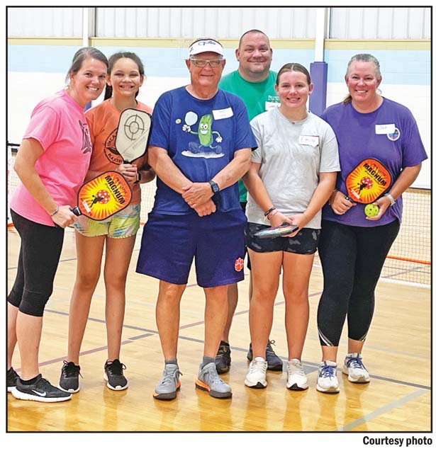 Pictured, from left, are Amy Bodie, Leah Bodie, instructor Ned Coryell, Richard “Gooch” O’Gooch, Emily O’Gooch and Jen O’Gooch learning to play pickleball at the CCRC clinic.