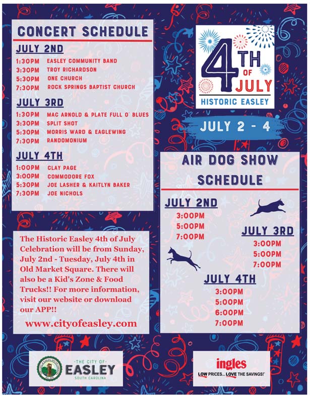 The city of Easley is throwing a three-day July 4 festival featuring live music Sunday through Tuesday at Old Market Square.