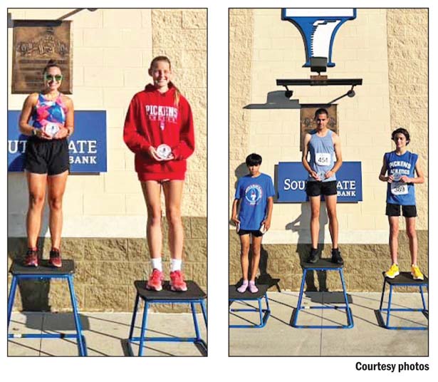 The Red, White & Blue Flame 5k was a success on June 24 on the campus of Pickens High School, with proceeds benefiting PHS athletics. The race directors would like to thank the sponsors, participants, volunteers and assistance from the Pickens police and fire departments. Pictured at left are female first-place finisher Marlee Dysart (22:27) and second-place Lauren Green. Not pictured is third-place finisher Emma Kutilek (25:50). Pictured at right are first-place male finisher Sam Sanneman (18:22), second-place Chase Ashe (18:57) and third-place Adam Ellis (19:32). The Red, White & Blue Flame 5k will return next year on June 22, 2024.