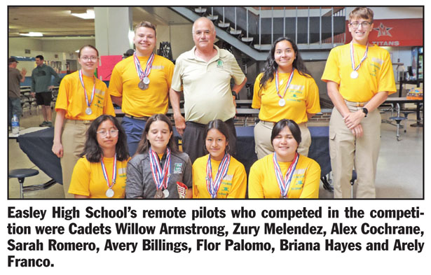 There were four events in the competition to be completed by all four of the cadet pilots from each team. The Gauntlet Course event is completed by flying a drone through the hallways completing a loop of around 20 obstacles. The Naval Flight Officer (NFO) event was completed by two cadet pilots, one controlling the drone without seeing the drone and the other cadet pilot directing the controlling pilot where to fly. The Maze Runner is a course that includes hallways and steps, with obstacles on both. And the last event was the Predator, a very interesting event. The pilot controlled the drone with their phone using the camera to locate clues to spell out nautical terms. Easley’s remote pilots who competed in the competition were Cadets Willow Armstrong, Zury Melendez, Alex Cochrane, Sarah Romero, Avery Billings, Flor Palomo, Briana Hayes and Arely Franco.