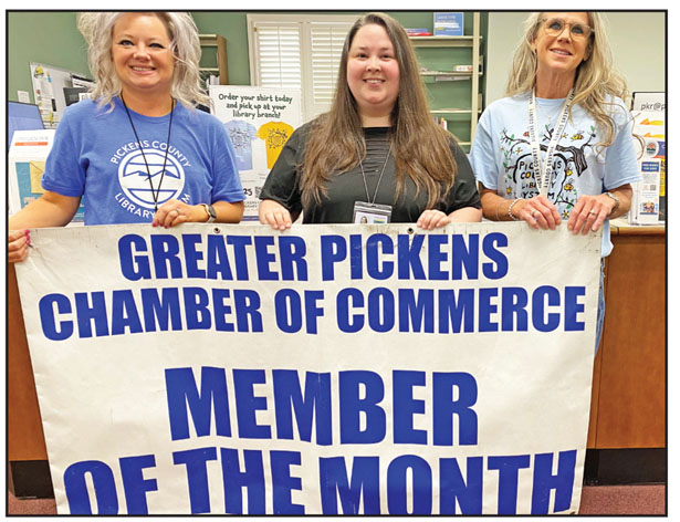 Pickens Village Branch Library has been named the Greater Pickens Chamber of Commerce Member of the Month for May. Summer reading at the library starts June 5 and runs until July 28. Visit pcls.fyi for more information about programs and the prizes children and adults can win. The library is at 124 N. Catherine St. in Pickens and is open Monday, Tuesday and Thursday from 9 a.m.-7 p.m., Wednesday and Friday from 9 a.m.-6 p.m. and Saturday 10 a.m.-2 p.m. Pictured are Elizabeth Smith, Audrey Hyde and Margaret Holder.