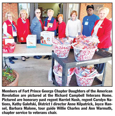 Members of Fort Prince George Chapter Daughters of the American Revolution loaded up six baskets with gifts during their February chapter meeting and then surprised the residents of Richard Campbell