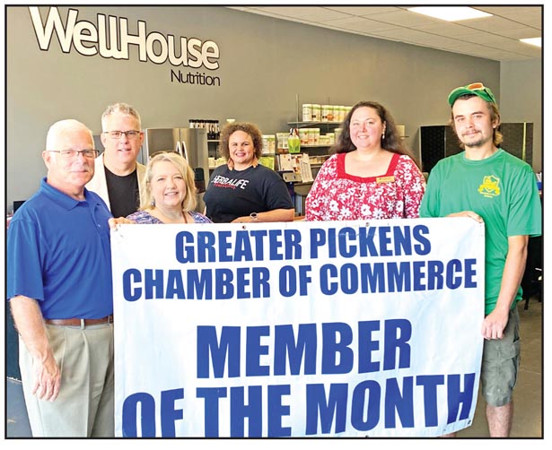 The Greater Pickens Chamber of Commerce’s September Member of the Month is Wellhouse Nutrition Smoothie and Juice Bar, located at 2700 Gentry Memorial Highway in Pickens. Wellhouse Nutrition is open Monday through Friday from 7 a.m.-1:30 p.m. and on Saturday from 8:30 a.m.-noon. The business offers healthy protein shakes, energy drinks, snacks, workout essentials and more to aid in weight loss, muscle gains or just good nutrition. Pictured, from left, are Bryan Owens, Bruce Tyson, Elian Tyson, owner Courtney Pelt, Jessica Callahan and Brandon Albertson. To find out more about Wellhouse Nutrition, visit http://courtneypelt.goherbalife.com or call (864) 507-4333.