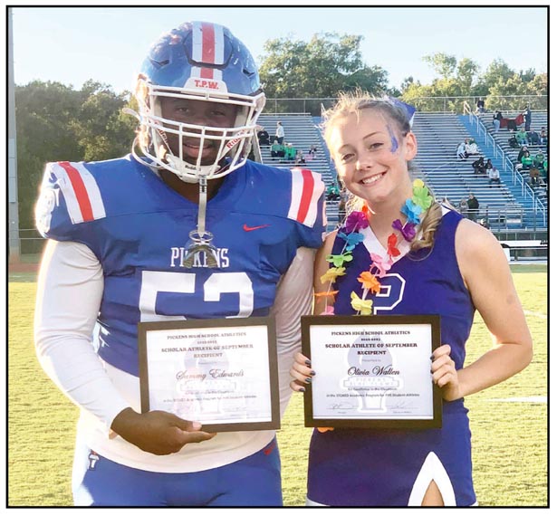 On Sept. 29, September Scholar-Athletes of the Month were named at Pickens High School. The female Scholar-Athlete is Olivia Wallen. Wallen is a junior and a member of the varsity cheer and cross-country teams. She was nominated by her personal finance teacher, Kathryn Holcombe. Wallen is the daughter of Derek and Amanda King. The male Scholar-Athlete is Sammy Edwards. Edwards is a member of the football team and was nominated by his English teacher, Christie Dunson. He is the son of Bobby and Sandra Rice. Scholar-Athletes are chosen for their leadership and academic excellence. This month’s award was sponsored by friends of the family of legendary former Pickens head coach Bill Isaacs, , in memory of his longtime service to PHS athletics.