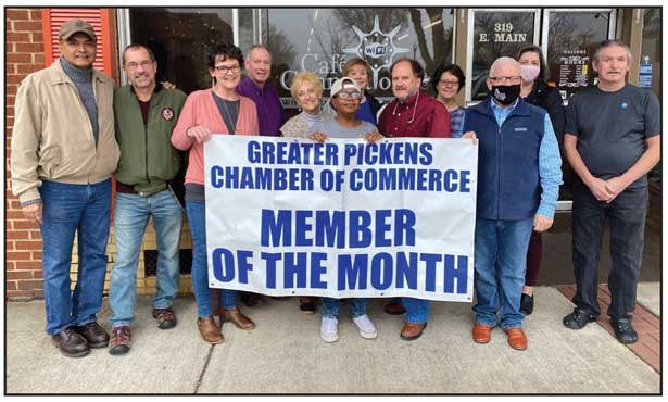 The Greater Pickens Chamber of Commerce has announced its February Member of the Month — Cafe Connections, located at 319 E. Main St. in Pickens. Cafe Connections earned the honor as a hospitality ministry intent on sharing the gospel through simple acts of love and kindness. Cafe Connections ministers the love of Jesus Christ to all people and from all different walks of life. Cafe Connections will be celebrating its ninth year on Main Street on Feb. 28. Pictured are Ann and Steve Corbin, volunteers and the Praying in Pickens Prayer Group, along with the chamber’s Lisa Turnick and Bryan Owens.