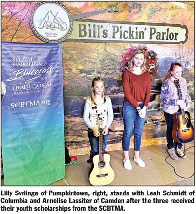 Lilly Svrlinga of Pumpkintown received a $300 award for her singing and picking skills on guitar and two styles of banjo. She performed at Bill’s Music Shop and Pickin’ Parlor in West Columbia after receiving her scholarship there in December.