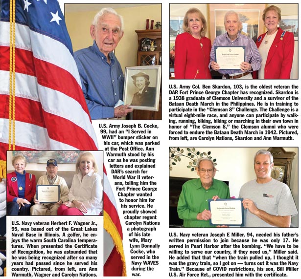 COUNTY — The Fort Prince George Chapter of the Daughters of the American Revolution (DAR) continues to recognize World War II veterans. Chapter regent Carolyn Nations and American history chair Ann Warmuth recently presented four veterans with DAR certificates in recognition of their service.
