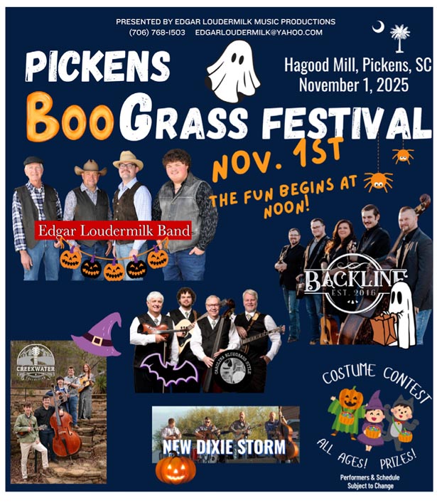 PICKENS — Enjoy a full day of bluegrass music and more at the historic Hagood Mill in