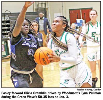 EASLEY — Falling behind 9-0 at the start of a matchup with Class 5A’s second-ranked Woodmont Wildcats last week, the Easley Green Wave girls’ basketball team needed to defend at its highest level and stop turning the ball over.