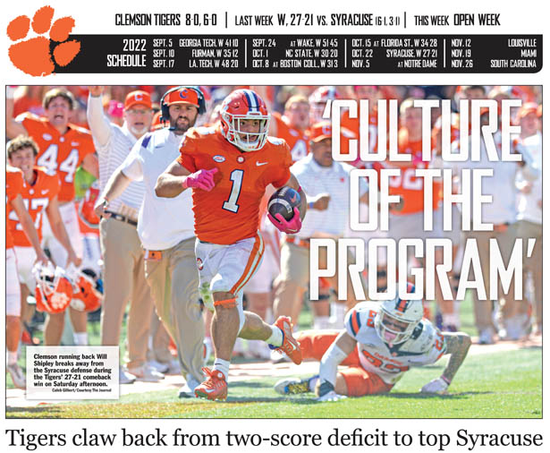 CLEMSON — For the fifth time this season, the Clemson Tigers entered into a game where both teams were undefeated, and for the fifth time this season, Clemson were the ones walking away with the win after coming from behind to drop No. 14 Syracuse 27-21.