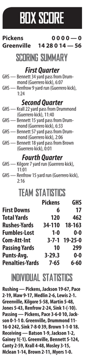 Pickens 56-0 under a second-half running clock to send everyone home a little earlier than usual for Friday night lights.