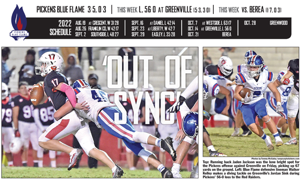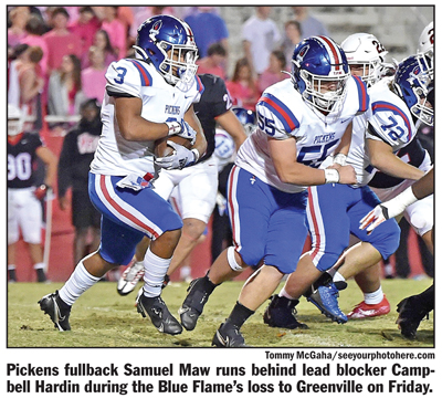 Then again, it was probably an experience the 2022 Pickens Blue Flame would rather forget. Greenville’s Red Raiders scored on all but one offensive possession to solidify their spot at the top of Region I-4A, finishing off