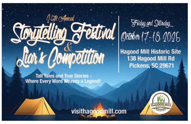 PICKENS — This October, the Hagood Mill Historic Site will once again echo with the laughter, chills, and wonder of Appalachian storytelling. On October 17–18, 2025, the annual Storytelling Festival & Liar’s Competition returns—this year featuring Friday Night Frights & Ghost Stories for a spook-tacular
