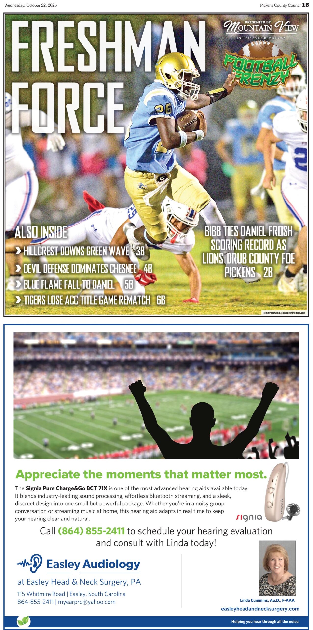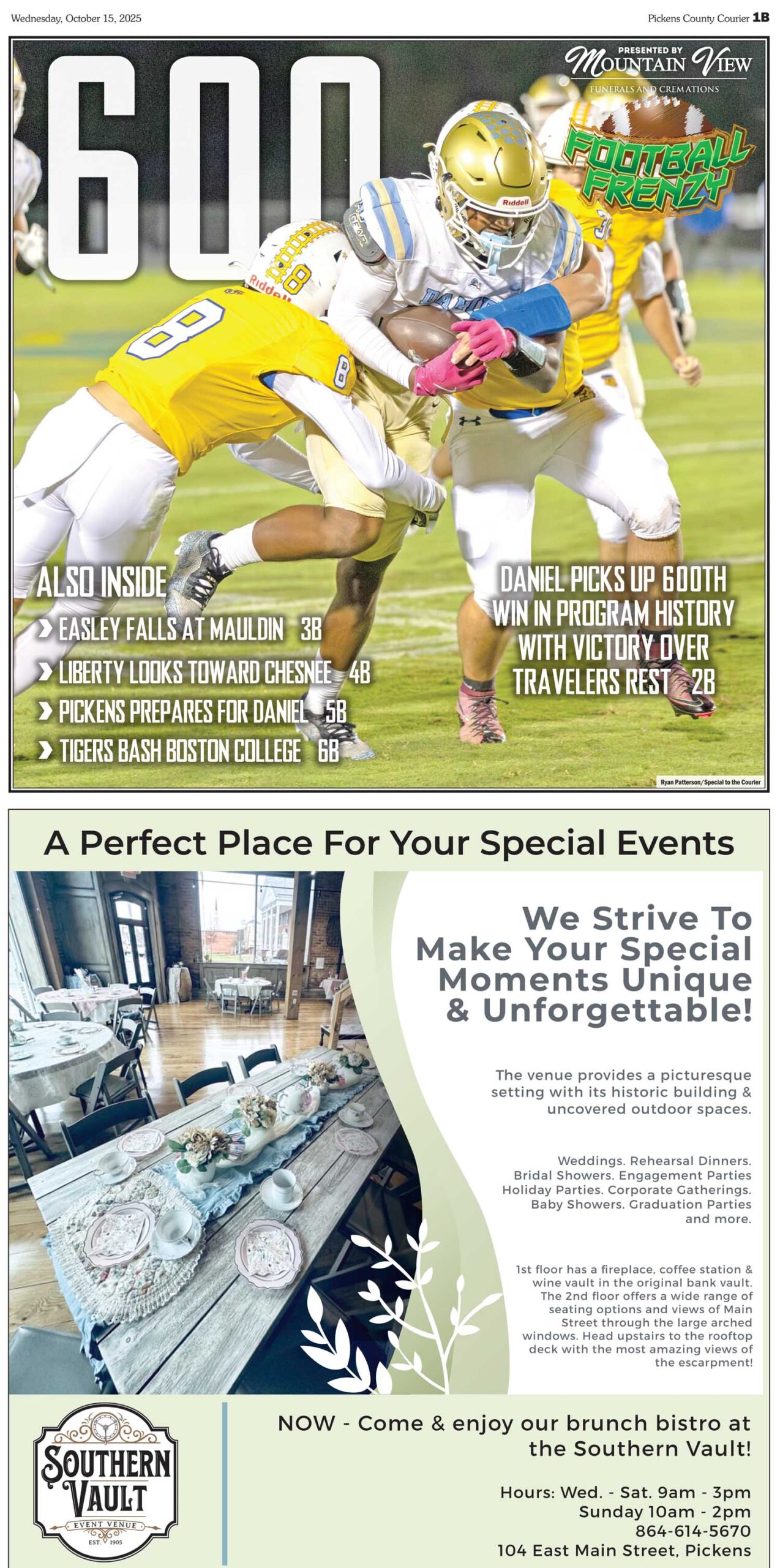 EASLEY FALLS AT MAULDIN; LIBERTY LOOKS TOWARD CHESNEE; PICKENS PREPARES FOR DANIEL; TIGERS BASH BOSTON COLLEGE all this and more in this week’s FOOTBALL FRENZY, sponsored by Mountain View Funerals and Cremations available only in the Pickens County Courier.