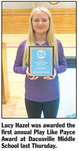 Dacusville Middle School’s Lucy Hazel, a lifelong friend and teammate of Chappell, received the inaugural award at a surprise assembly held at the school.