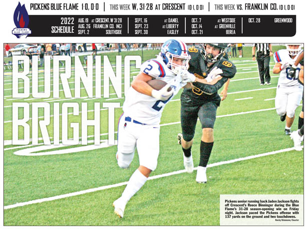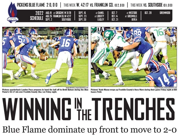 As the Blue Flame look ahead to a matchup this week with Franklin County (N.C.), Smith said the Lions will be a similar team to Pickens — a big and physical team of athletes. Franklin County is coming off a 35-6 loss to Madison County (N.C.).