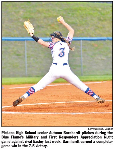 PICKENS — Hosting Military and First Responders Appreciation Night last Tuesday, the Pickens Blue Flame held off a late Easley rally to capture a 7-5 win on the softball diamond.