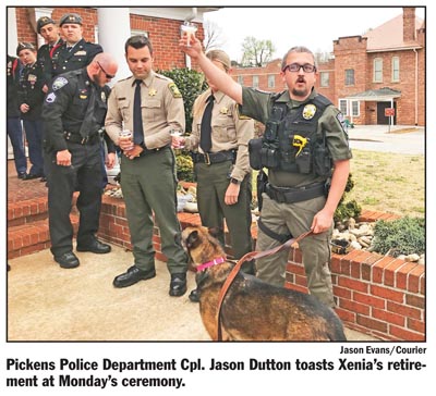 The department held a retirement ceremony in front of Pickens City Hall for K-9 officer Xenia.